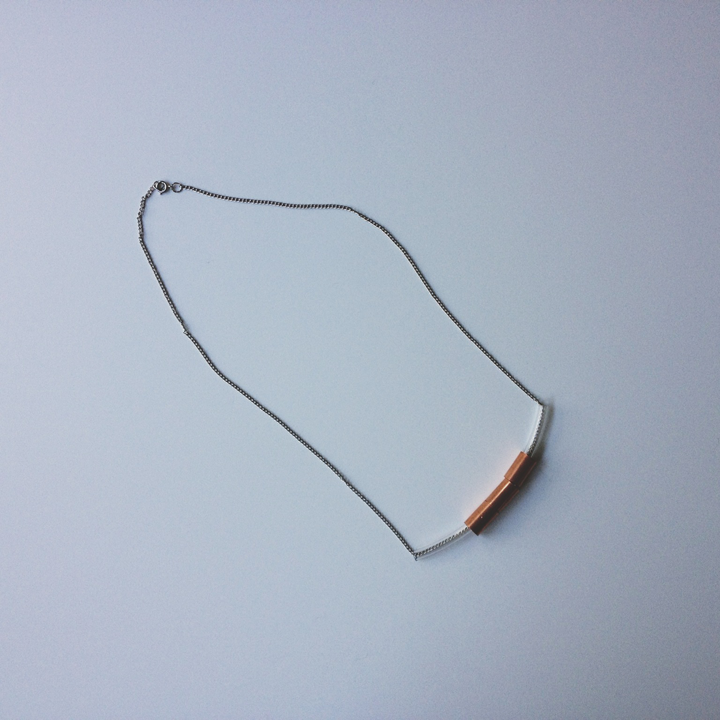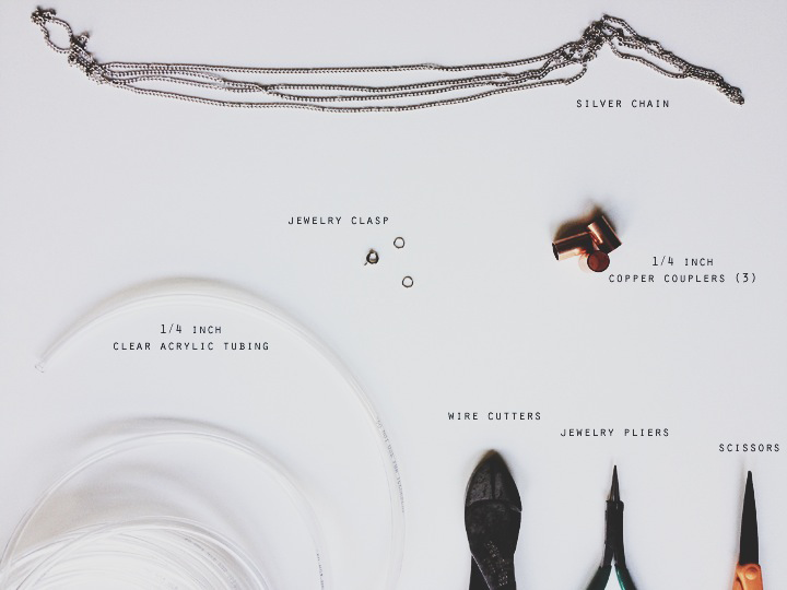 I’ve been dreaming about making this necklace for a while, and finally took a trip to Lowe’s and picked up the perfect supplies. Using a silver chain, clear acrylic tubing, and copper couplers, this necklace is the perfect blend of industrial and sparkle!