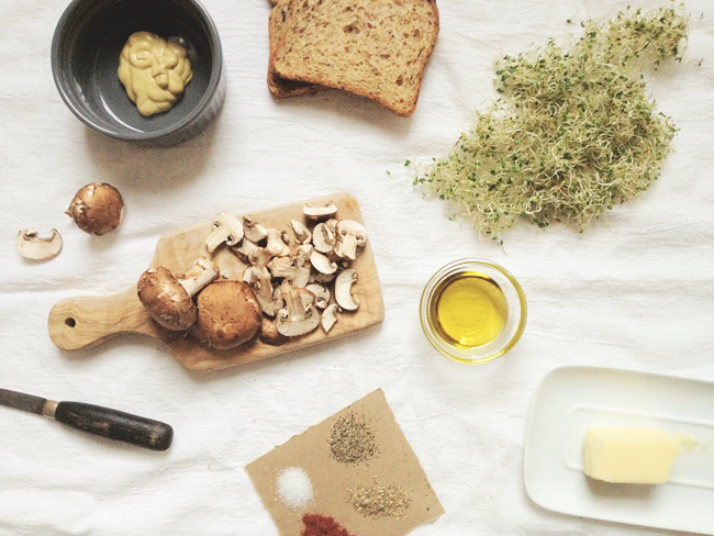 Brush mushrooms with with a dry paper towel or pastry brush (don’t wash mushrooms, they’ll retain too much water). Slice and saute in about a tablespoon of olive oil. While the mushrooms cook, mix together in a small bowl the mustard, paprika, salt and pepper. When mushrooms are almost finished, sprinkle in thyme. Spread one side of each slice of bread with butter, and lightly toast in a frying pan, 2-3 minutes on each side. Spread mustard mixture on bread, then pile on the mushrooms and sprouts.