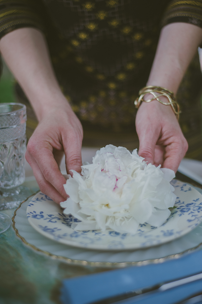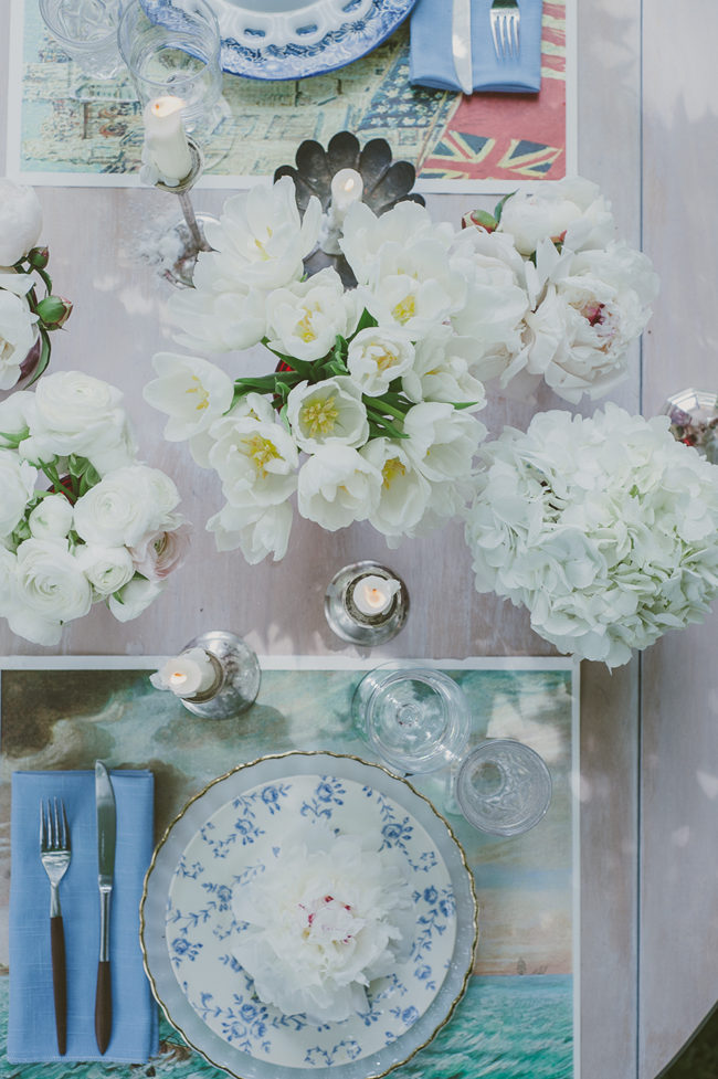 I always prefer to use real dishes for gatherings, even if just a casual 4th of July celebration. They’re prettier, and add an element of charm and thoughtfulness to the dinner. For this tabletop, I simply collected white and blue & white flowered plates and layered them. They don’t have to match perfectly, and keeping the colors limited to blue and white allows for the diversity of patterns. Place a fresh flower on each guest’s plate and you instantly have the easiest and prettiest place setting.