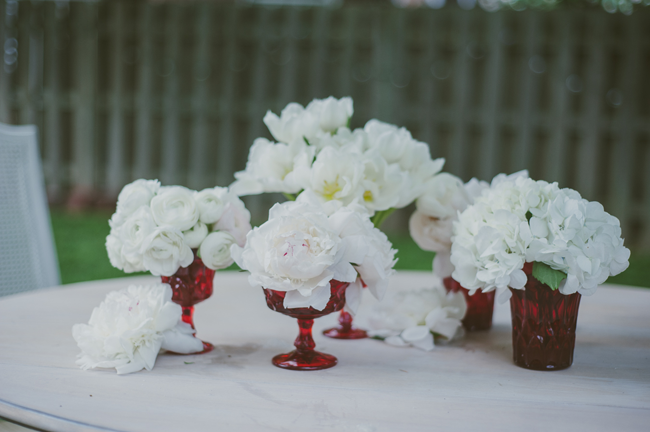 The centerpiece is a collection of red vintage glassware and white blooms – tulips, peonies, ranunculus, and hydrangea. Anyone can recreate this simple and refined centerpiece.