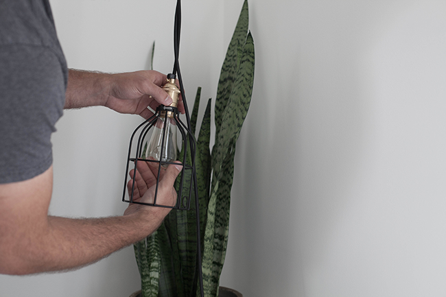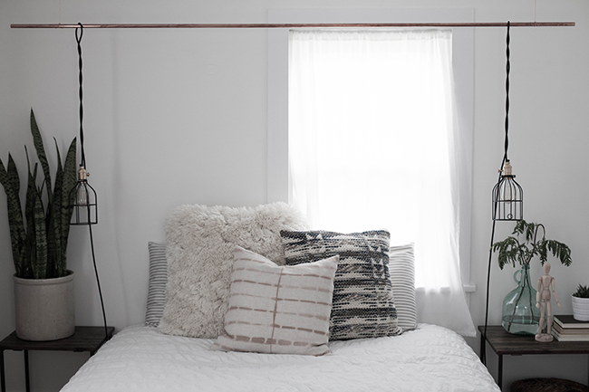 6. Drape cord over copper pipe and twist 2 ends together to desired length. Then attach bulb cage and insert bulb. Insert plug end into wall outlet. Repeat on other side. Voila. Hanging bedside lighting done!