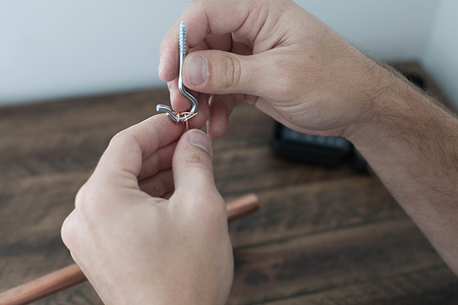 2. Attach length of copper wire to screw hooks (length depends on how low you want copper pipe to hang). Twist copper wire around screw hooks in desired pattern, ensuring the wire is tightly wound. See image. Insert screw hooks with wire into holes drilled into ceiling.