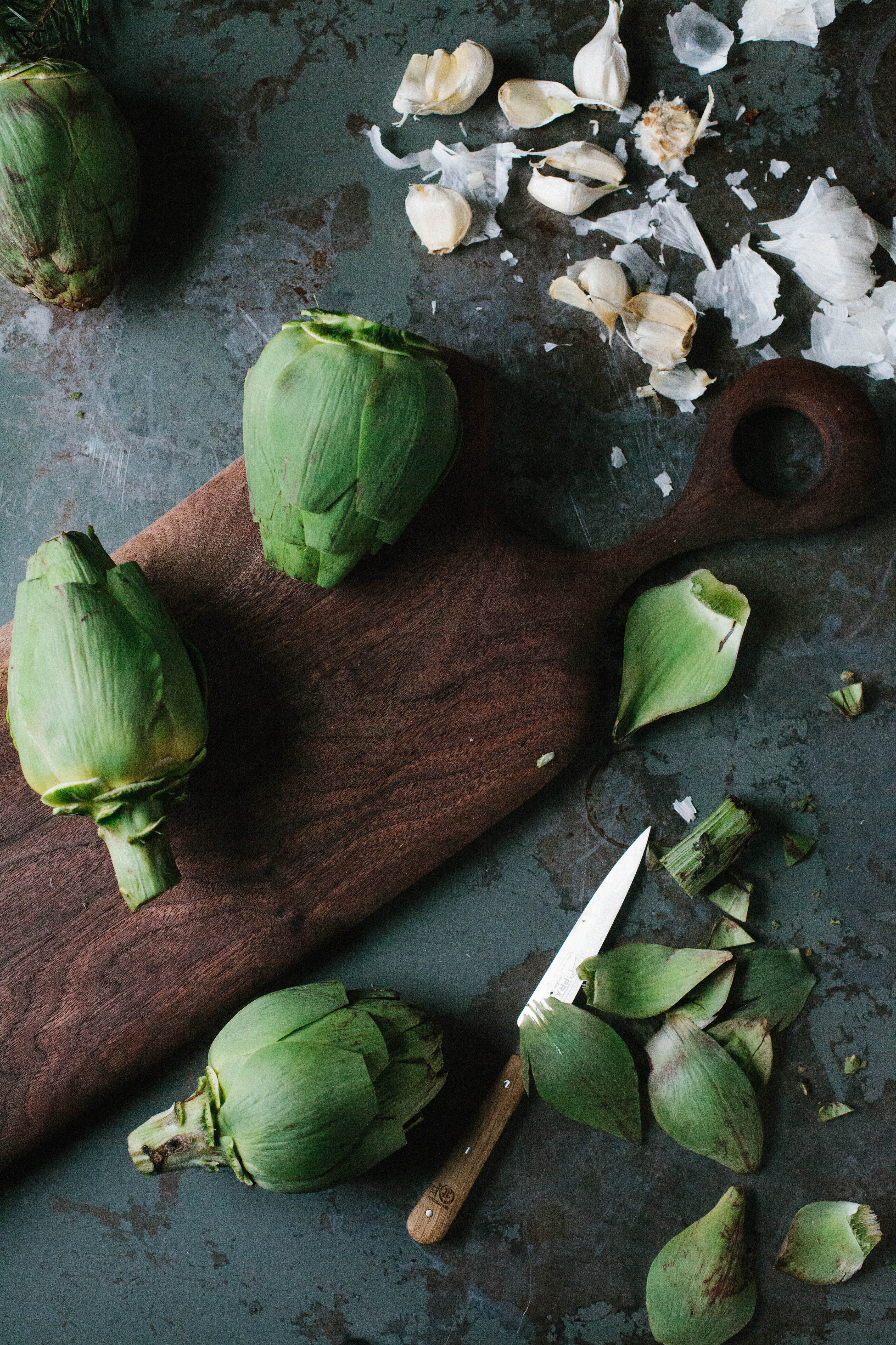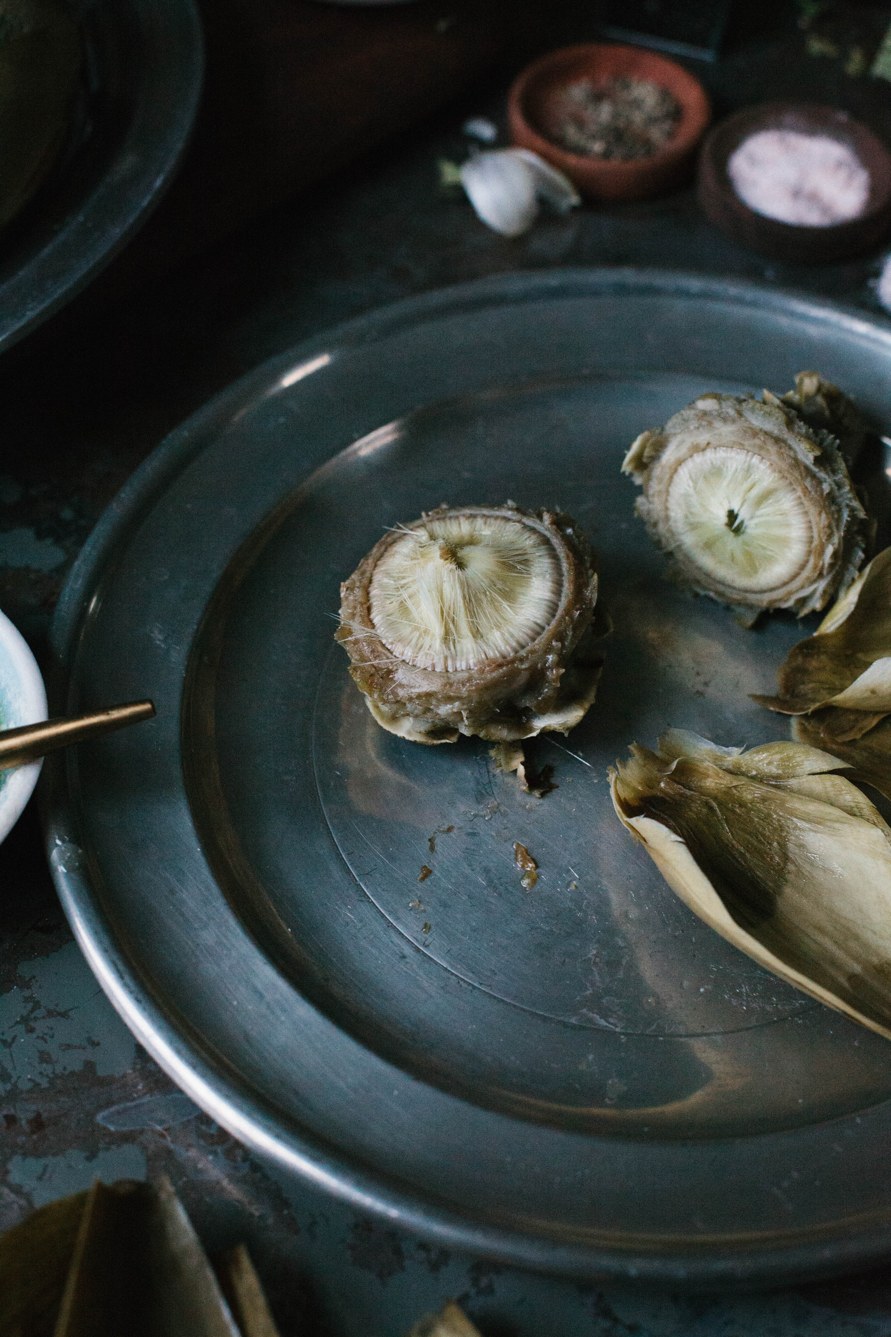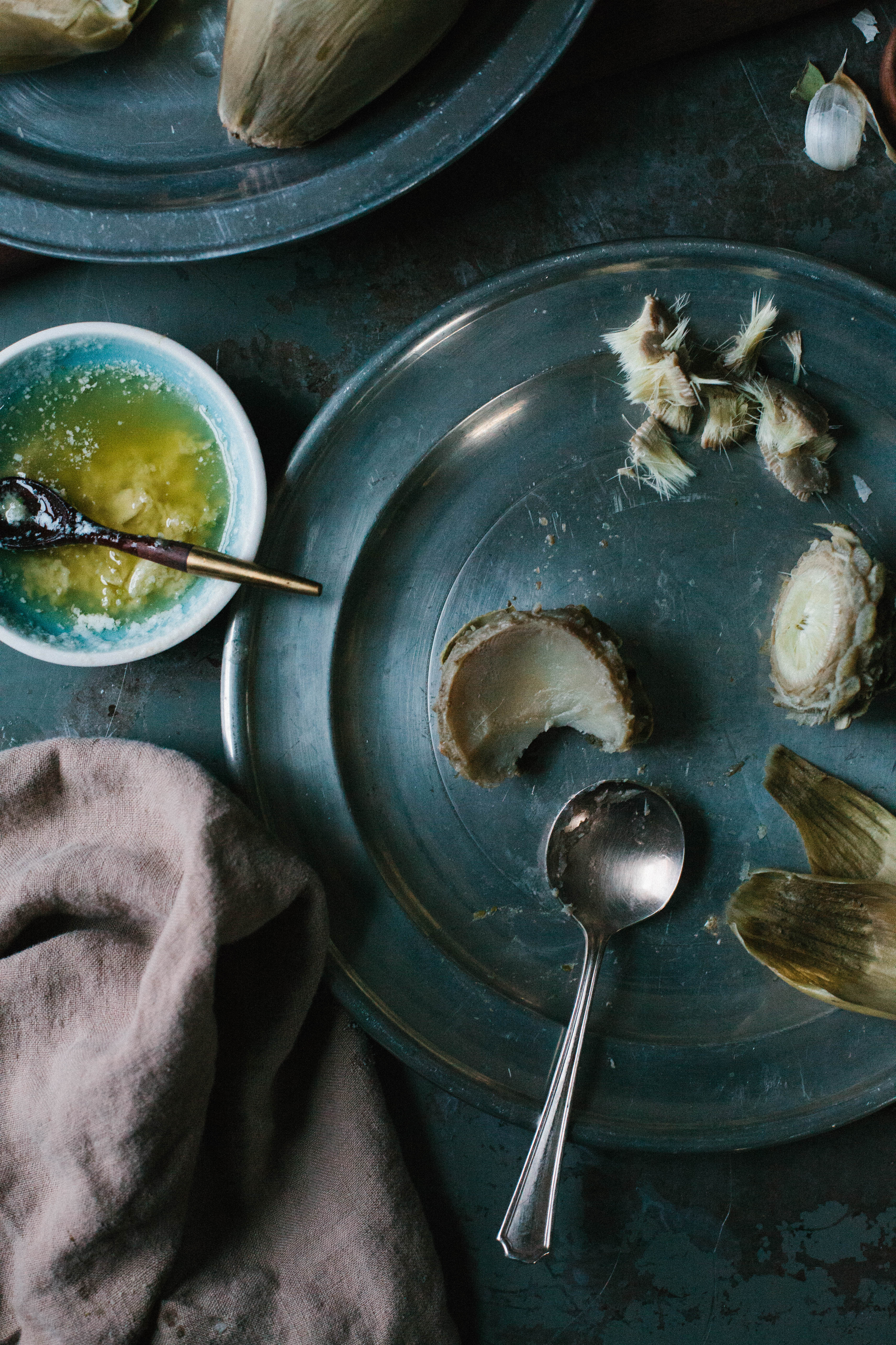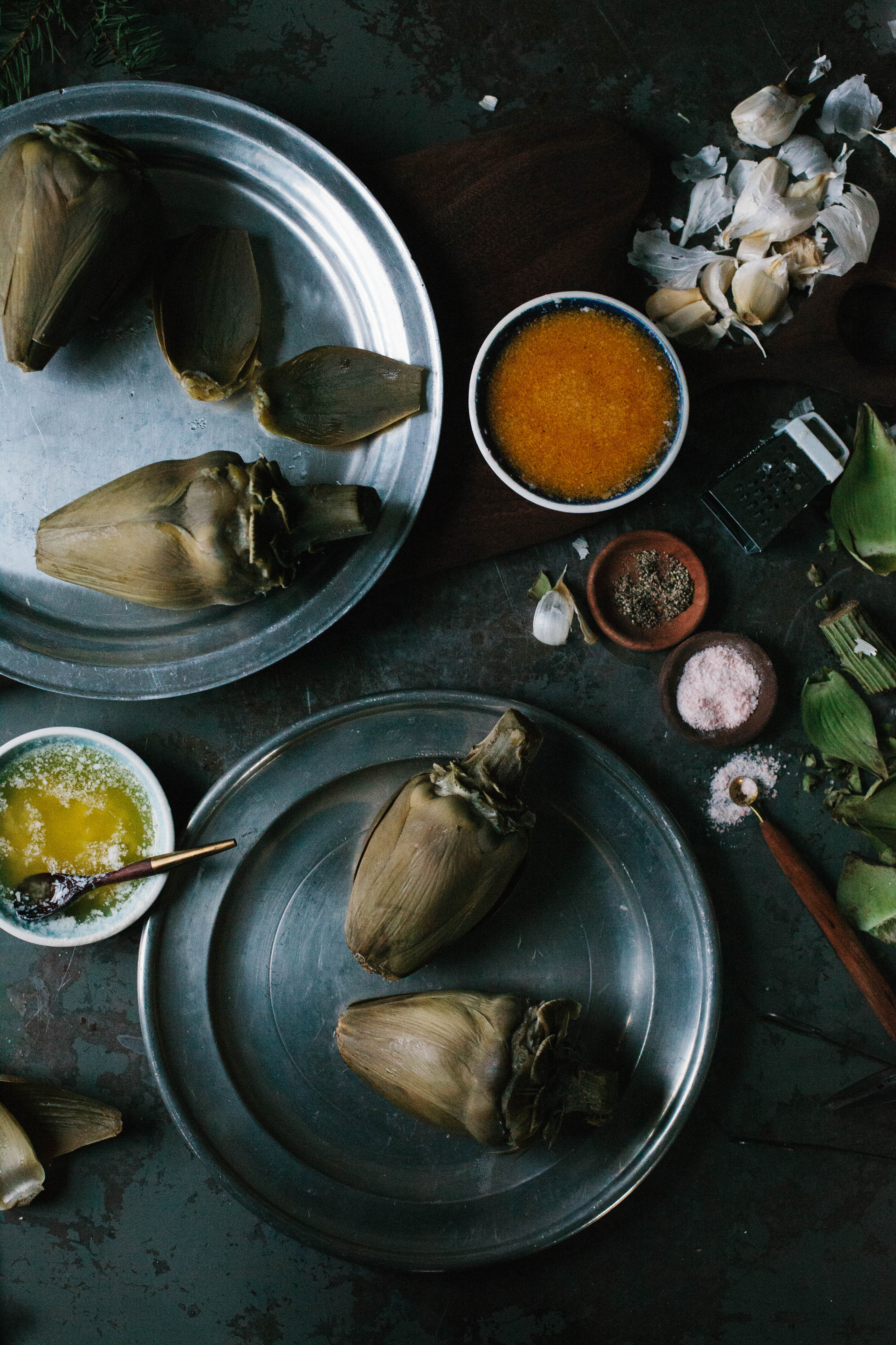 I was reminded just how earthy and satisfying artichokes are, and decided to share them with you! They’re the perfect appetizer (thinking about making them for New Year’s Eve). Here, I’ve put together two favorite dipping sauces, both made with butter.