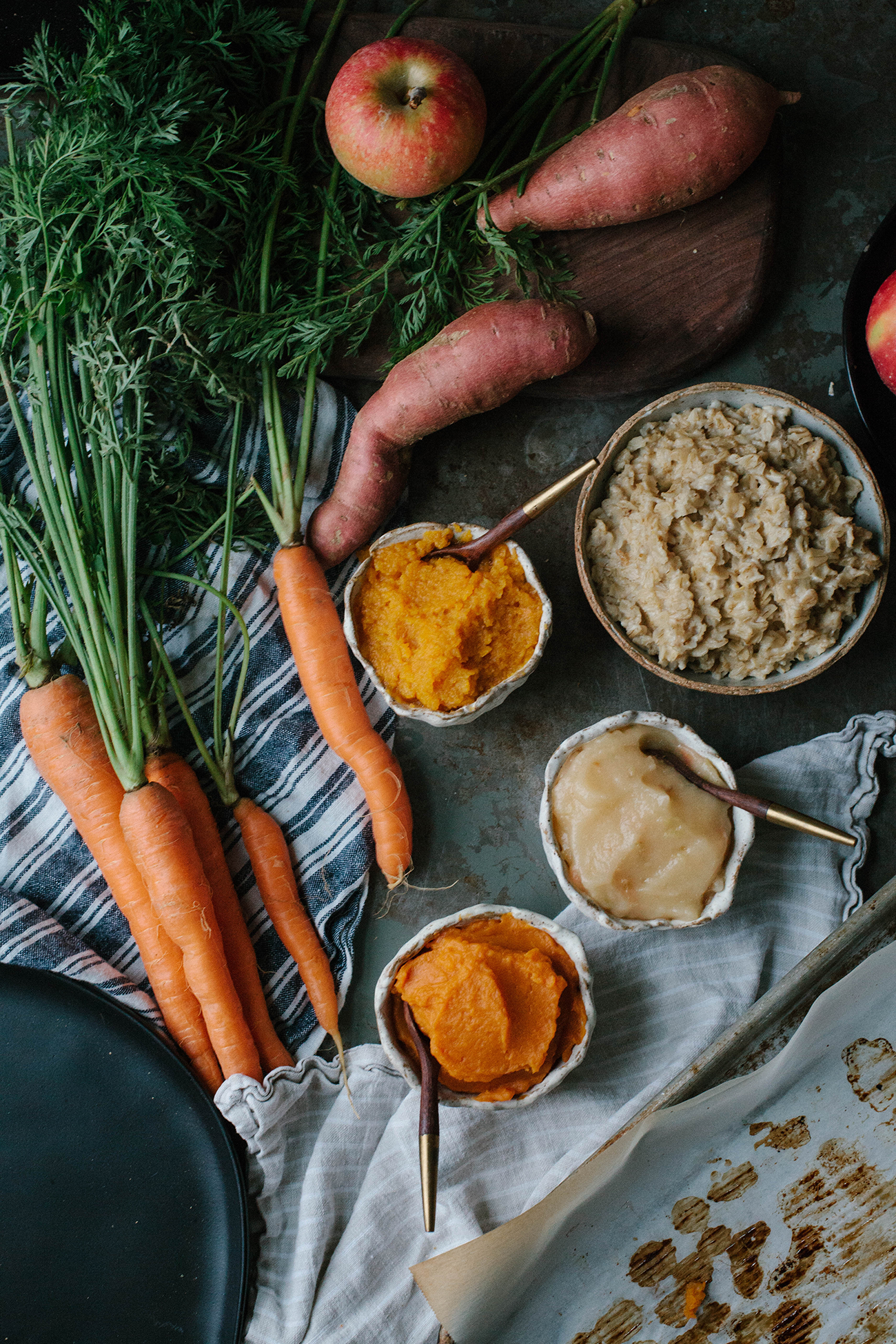 Preheat oven to 400 degrees. Peel and roughly chop fruits and vegetables. Place on parchment-lined baking sheet (without mixing together), and roast for about 35 minutes, stirring about halfway through. You want them to be very soft. Remove from oven and purée each fruit/vegetable separately, using blender or small food processor. Add about 2 tbsp water to thin out as necessary.