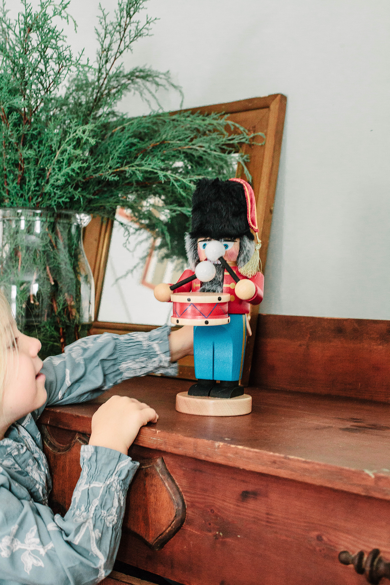 Our household is minorly (read: majorly) obsessed with The Nutcracker ballet, so to have our own nutcracker that actually works is almost too much for the girls to handle! After setting him out on our pie safe, Naomi gazed at him for a while, no doubt dreaming of her own Nutcracker. Ha, maybe I shouldn’t encourage her!