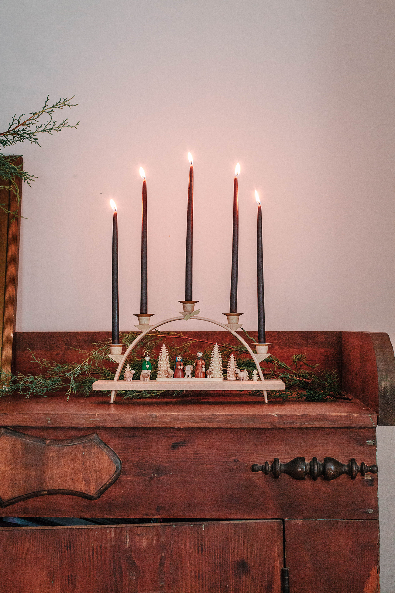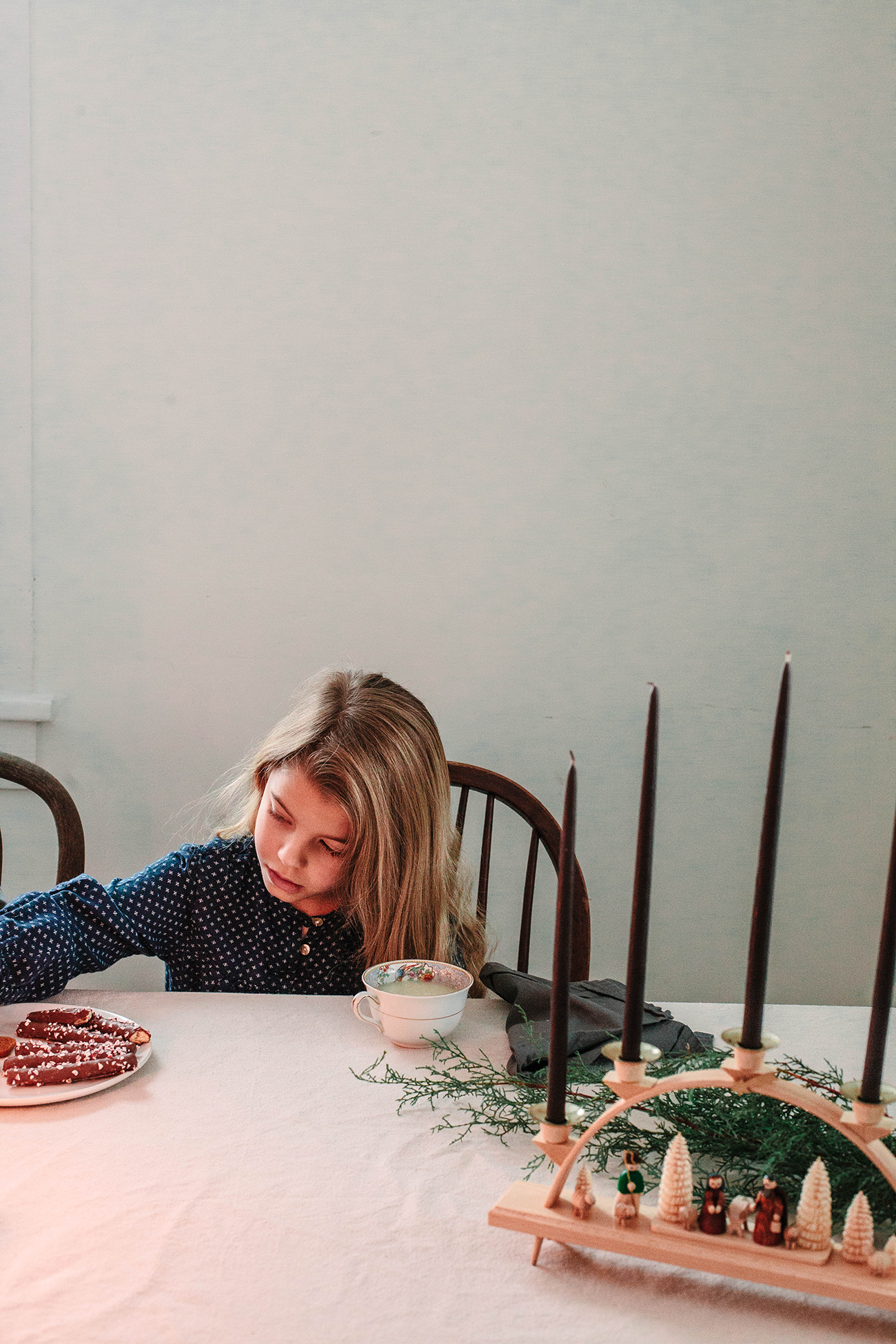 After the girls came inside and warmed up with bowls of hot oatmeal, they got to help unpack our new Christmas decorations and help with the candles while drinking tea and sharing some sweet treats. They have been waiting a few weeks to see how the tiered Nativity Pyramid works, and they were fascinated. When I was a young girl, my aunt and uncle had a vintage Nativity pyramid, and I’d always beg them to light the candles so I could be mesmerized for hours. And how we have one of our own for our family to enjoy! I am so excited!