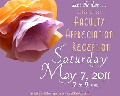 I have the privilege and the super exciting job of planning my CLASS OF 2011’s Faculty Appreciation Reception. Traditionally, we invite all full time & adjunct faculty & key administrators/staff…and spend the evening honoring these people who’ve had such immense influence on our class over the past 4 years. This year I plan on making […]